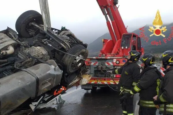 L'autista di un mezzo pesante, per cause in corso di accertamento, ha perso il controllo del mezzo che stava conducendo e che si è ribaltato sulla sede stradale perdendo parte del carico di collettame che trasportava.