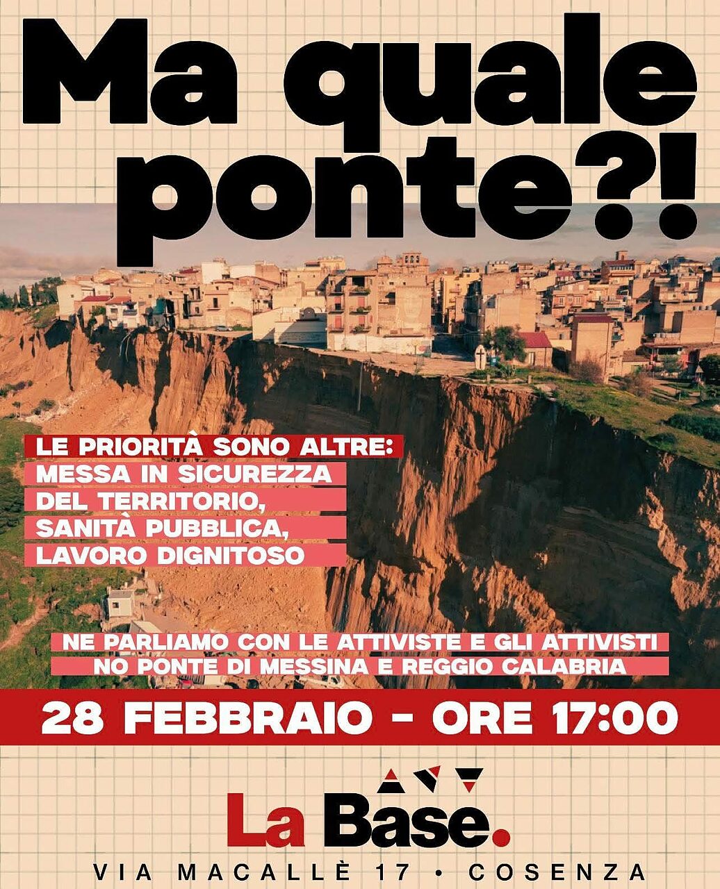 L’appuntamento per discutere e organizzare l’opposizione al cosiddetto “modello Ponte di Messina” è fissato per sabato 28 febbraio 2026 alle ore 17.00, a La Base, in via Macallè a Cosenza. All’incontro parteciperanno attivisti e attiviste No Ponte provenienti da Messina e Reggio Calabria, con l’obiettivo di rafforzare una mobilitazione che, assicurano, continuerà nei prossimi mesi.