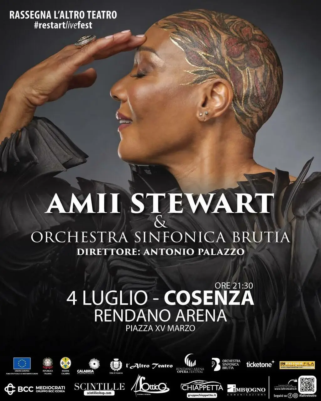 L’artista statunitense si esibirà in piazza XV Marzo, nel cuore del centro storico di Cosenza, accompagnata dall’Orchestra Sinfonica Brutia in una speciale formazione ritmico-sinfonica diretta dal Maestro Antonio Palazzo. Un connubio inedito tra soul, pop, disco e arrangiamenti orchestrali che promette una serata spettacolare. I 35 elementi dell’orchestra, affiancati da sezione ritmica, tastiere, basso e percussioni, accompagneranno Amii Stewart in un viaggio tra le hit che l’hanno resa celebre in tutto il mondo, da Knock on Wood – otto milioni di copie vendute – a Friends, Perfectly Beautiful, Together e il recente singolo Mama.