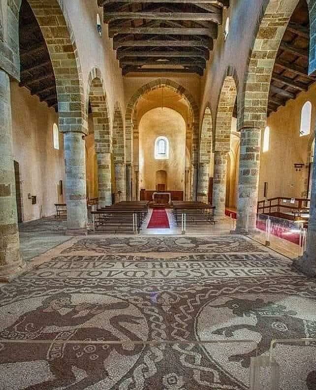 Uno degli elementi più suggestivi dell’interno è il pavimento musivo, testimonianza preziosa dell’incontro tra culture che caratterizzò la Calabria medievale. I motivi decorativi, realizzati con tessere policrome, richiamano simboli e figure di forte valore spirituale, tra cui animali e motivi geometrici che rimandano alla tradizione bizantina. L’altare, semplice ma solenne, si inserisce perfettamente in questo contesto, valorizzando la profondità dello spazio liturgico. L’influenza bizantina, del resto, è evidente in diversi dettagli, a conferma del ruolo che il monastero ebbe come centro di cultura e spiritualità in un territorio dove convivevano tradizioni greche e latine. Camminando lungo la navata, lo sguardo è naturalmente attirato dai particolari architettonici, dalle colonne agli archi, che conservano tracce della maestria degli artigiani che realizzarono l’edificio.