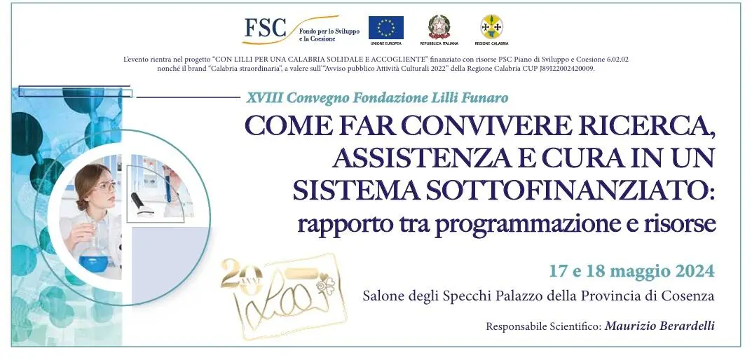 La Fondazione Lilli Funaro, nel ventesimo anno di attività, prosegue il suo lavoro con il XVIII Convegno scientifico, intitolato "Come far convivere ricerca, assistenza e cura in un sistema sottofinanziato: rapporto tra programmazione e risorse", che si terrà il 17 maggio 2024 dalle 15.30 alle 19.00, e il 18 maggio dalle 8.30 alle 14.00, presso il Salone degli specchi del Palazzo della Provincia di Cosenza, in piazza XV marzo.