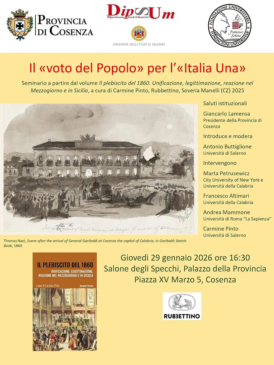 Si terrà il 29 gennaio, nella sede della Provincia di Cosenza, il convegno dal titolo Il voto del popolo per l’Unità d’Italia, dedicato al plebiscito unitario dell’Italia meridionale del 1860. L’iniziativa intende offrire una rilettura storica e critica di uno dei passaggi fondamentali del Risorgimento, mettendo al centro il ruolo delle popolazioni del Sud nel processo di unificazione nazionale.