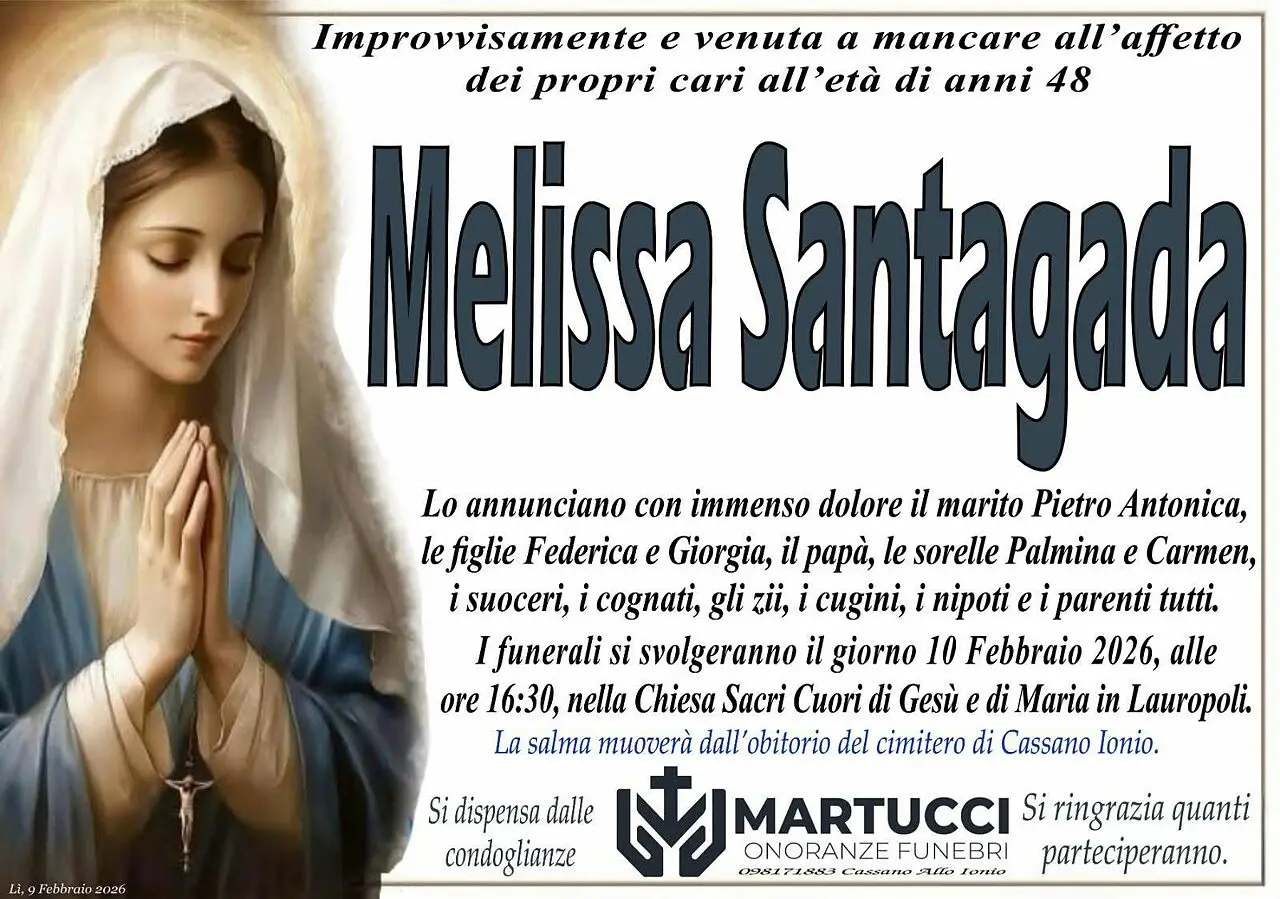 Oggi, 10 febbraio, la comunità di Lauropoli, frazione di Cassano allo Ionio, dirà addio a Melissa Santagada, la 48enne tragicamente deceduta il giorno precedente, il 9 febbraio, dopo una caduta dal secondo piano della sua abitazione. I funerali si terranno alle 16:30 presso la Chiesa Sacri Cuori di Gesù e di Maria di Lauropoli, dove familiari, amici e cittadini si raduneranno per rendere omaggio a una donna che lascia nel dolore il marito e due figlie.