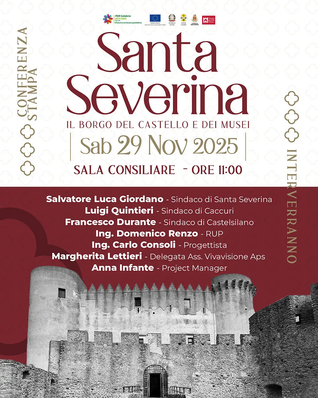 Durante l’incontro saranno illustrati i principali interventi previsti e il futuro sviluppo del borgo. Parteciperanno il sindaco di Santa Severina, Salvatore Luca Giordano, insieme ai sindaci di Caccuri e Castelsilano, Luigi Quintieri e Francesco Durante, e figure chiave del progetto come l’ingegner Domenico Renzo, Rup, l’ingegner Carlo Consoli, progettista, Margherita Lettieri per l’associazione Vivavisione Aps e la Project Manager Anna Infante. Saranno presentate le strategie di valorizzazione, restauri e strumenti innovativi pensati per i cittadini e i visitatori.
