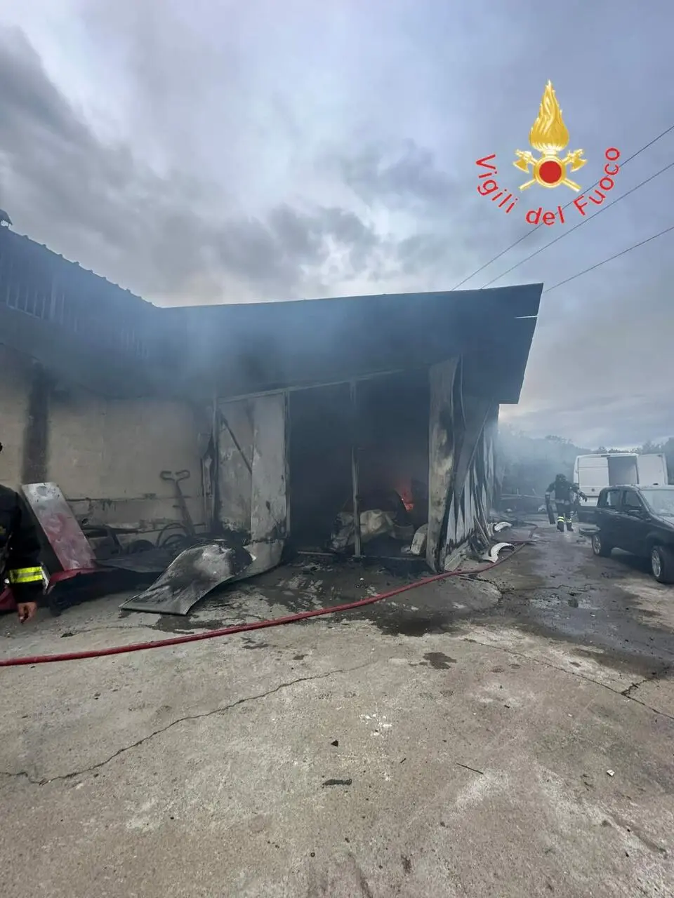 Il rogo ha completamente distrutto tre autovetture, due motocicli e un camper, presenti all'interno della struttura. L'edificio interessato, composto da due livelli in parte adibito ad attività di verniciatura, conteneva diversa attrezzatura professionale, anch'essa coinvolta dalle fiamme.