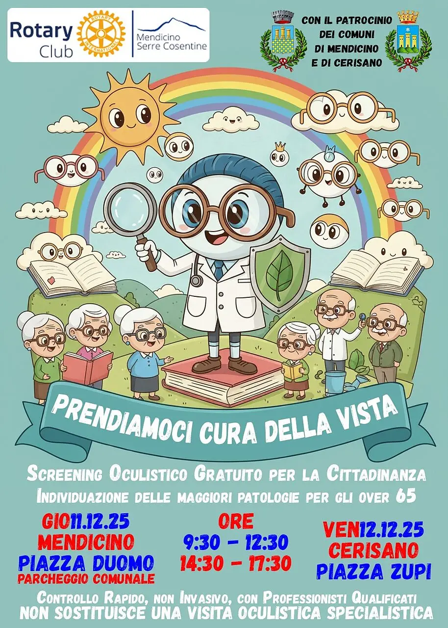 Domani, 11 dicembre, il Rotary Club Mendicino Serre Cosentine, in collaborazione con il Comune di Mendicino, organizza una giornata di screening oculistico gratuito rivolta alla popolazione anziana. L’obiettivo è favorire la prevenzione e individuare in tempo le principali patologie oculari legate all’età. Grazie alla presenza di medici oculisti e dei volontari dell’associazione dei non vedenti, i partecipanti potranno sottoporsi a misurazioni della pressione oculare e a una prima valutazione di retina e cristallino, utilizzando la strumentazione portatile fornita dalla IAPB – Agenzia Internazionale per la Prevenzione della Cecità.