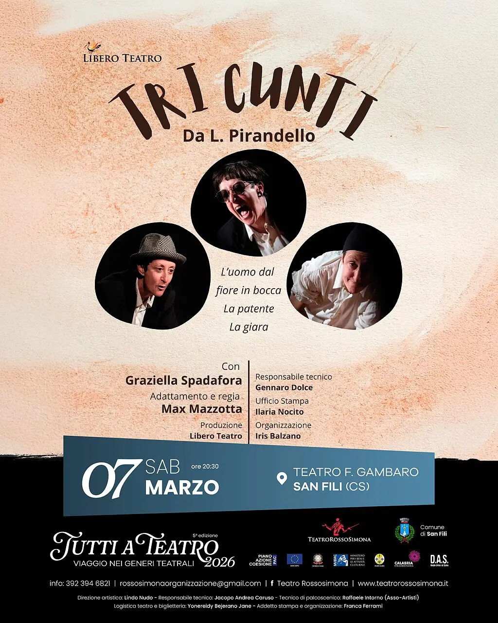 Un viaggio tra ironia, riflessione e assurdità dell’esistenza attraverso il teatro di Luigi Pirandello. Sabato 7 marzo alle 20.30 il teatro Gambaro di San Fili ospita “Tri Cunti”, spettacolo prodotto dalla compagnia Libero Teatro e diretto da Max Mazzotta. In scena tre celebri testi pirandelliani – L’uomo dal fiore in bocca, La patente e La giara – interpretati da una sola attrice, Graziella Spadafora, che dà vita ai diversi personaggi attraversando identità e maschere della società.