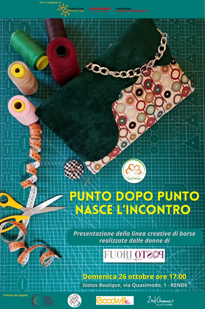 “Punto dopo punto nasce l’incontro” è il claim che accompagna la presentazione ufficiale della nuova linea artigianale di borse “Fuori Posto”, in programma domenica 26 ottobre alle 17.00 nello spazio di Status Boutique in via Quasimodo 1 a Rende. L’iniziativa è promossa dall’associazione APS Sostenia  nasce come espressione concreta di rinascita e valorizzazione del talento femminile. Le borse, realizzate a mano, uniscono creatività, tradizione e design, raccontando percorsi personali e collettivi di riscatto.