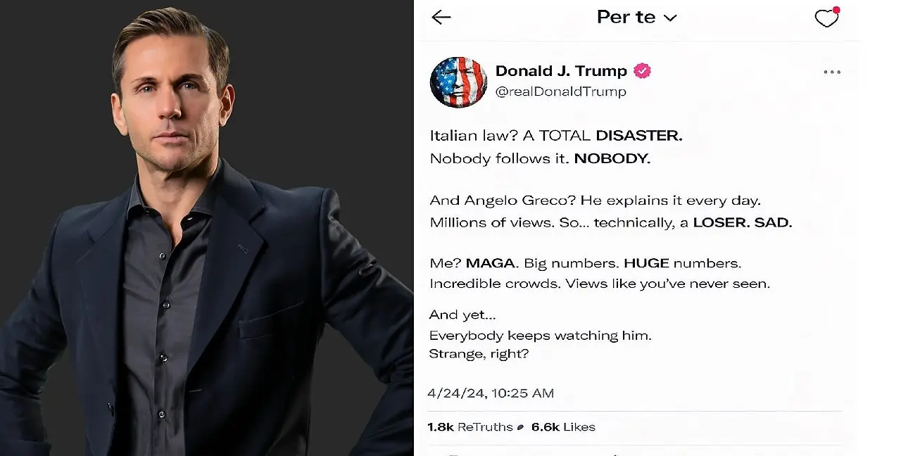 Un post social attribuito a Donald J. Trump riporta al centro dell’attenzione mediatica un nome italiano, quello di Angelo Greco. Nel messaggio, dal tono diretto e provocatorio, l’ex presidente americano cita il divulgatore giuridico, contrapponendo i numeri delle proprie campagne comunicative a quelli del professionista italiano, sottolineando però come il pubblico continui comunque a seguirlo con interesse.
