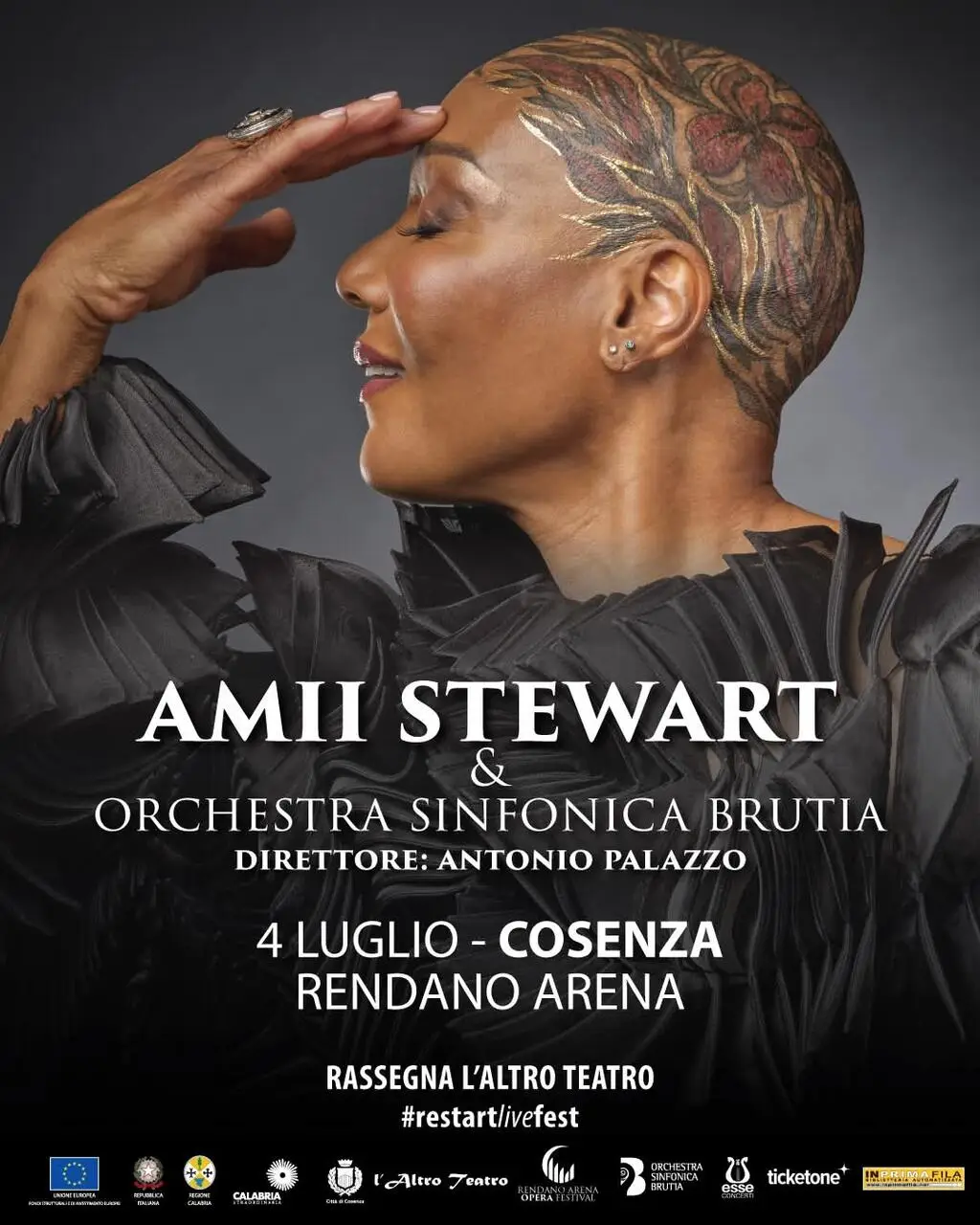 Il 2 luglio sarà invece la volta del più grande live show anni novanta d'Italia. Dopo il successo dello scorso anno, che ha fatto ballare ininterrottamente il pubblico per oltre due ore e mezza, torna a Cosenza il format musicale "Voglio Tornare negli anni 90". Uno spettacolo unico nel suo genere e adatto a tutte le età, con ballerini, dj, frontman, mascotte e tantissimi effetti speciali, per rivivere la magia di un decennio iconico. Il 4 luglio Rendano Arena accoglierà una star internazionale e icona del pop anni '80: Amii Stewart. Voce inconfondibile e interprete che ha conquistato il cuore di milioni di fan in tutto il mondo, l'artista della disco music sarà accompagnata dall'Orchestra Sinfonica Brutia, in una formazione ritmico-sinfonica diretta dal Maestro Antonio Palazzo. Sarà un viaggio musicale che ripercorrerà i grandi successi della sua carriera, da Knock on Wood a Friends, Perfectly Beautiful e Together, fino a nuove interpretazioni dei brani da lei più amati, con omaggi ai cantautori italiani e al Maestro Ennio Morricone. L'Orchestra Sinfonica Brutia, già protagonista lo scorso anno al #RestartLiveFest accanto a Edoardo Bennato, prosegue così il suo percorso nel mondo pop sotto la guida del direttore artistico Francesco Perri. Saranno 35 gli elementi dell'orchestra, arricchita da pianoforte, basso, tastiere, batteria e percussioni, ad accompagnare Amii Stewart, pronta a travolgere il pubblico con la sua energia senza tempo.