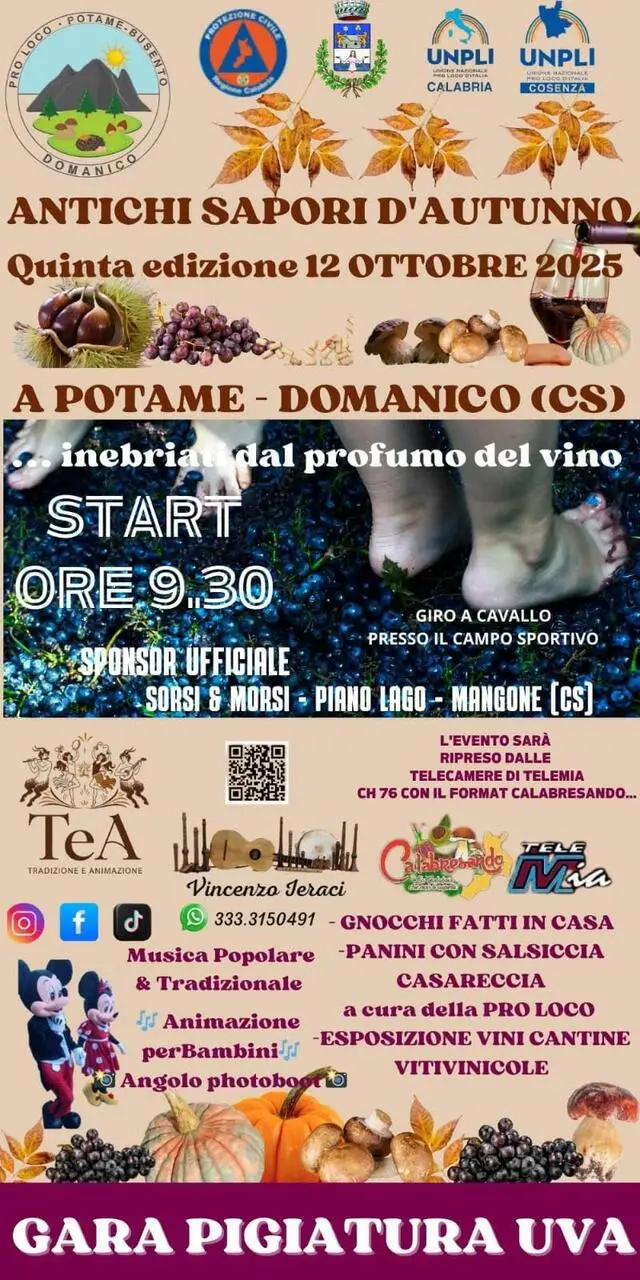 Domenica 12 ottobre 2025 Potame, frazione di Domanico, ospiterà la quinta edizione della manifestazione “Antichi Sapori d’Autunno”, un evento pensato per celebrare le eccellenze enogastronomiche e artigianali del territorio calabrese. L’appuntamento prenderà il via alle 9:30 con un giro a cavallo, preludio alle tante iniziative previste durante la giornata: musica popolare, animazione per bambini, esposizione di cantine vitivinicole e la tradizionale gara di pigiatura dell’uva. Sarà inoltre possibile degustare piatti tipici come gnocchi fatti in casa e panini con salsiccia.