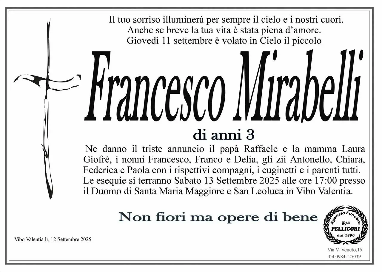 Il dolore della famiglia è stato affidato anche alle parole del manifesto funebre che in queste ore campeggia sui muri della città: “Il tuo sorriso illuminerà per sempre il cielo e i nostri cuori. Anche se breve, la tua vita è stata piena d’amore”. A darne il triste annuncio sono mamma Laura, papà Raffaele, i nonni, gli zii e i cuginetti, che sabato 13 settembre alle 17 accompagneranno Francesco nel suo ultimo viaggio terreno nel Duomo di Santa Maria Maggiore e San Leoluca. La famiglia ha chiesto che non vengano portati fiori, ma compiute opere di bene, un segno di speranza che trasforma il dolore in un gesto di amore e di solidarietà.