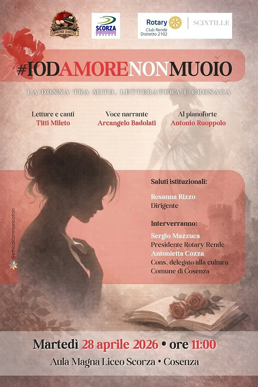 “Iodamorenonmuoio” è il titolo del recital teatrale tratto dal libro del giornalista e scrittore Arcangelo Badolati, i cui proventi sono interamente destinati in beneficenza. L’opera, impreziosita dalla prefazione di Matilde Lanzino, madre della giovane vittima di un tragico femminicidio avvenuto nel 1988, sarà portata in scena il 28 aprile nell’auditorium del Liceo “Scorza” di Cosenza. L’iniziativa coinvolgerà studenti e studentesse dell’istituto ed è promossa dal Rotary di Rende, con il supporto delle istituzioni locali e della dirigenza scolastica.