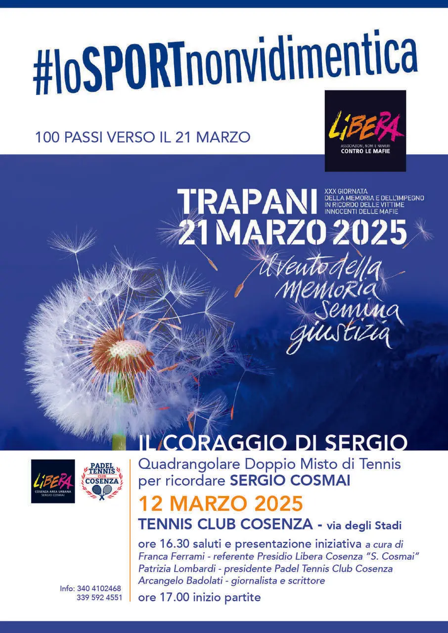 Il 21 marzo Trapani ospiterà la 30ª Giornata della Memoria dell’Impegno, dedicata alle vittime innocenti delle mafie. In vista della manifestazione, il Presidio Libera di Cosenza ha organizzato un evento speciale per ricordare Sergio Cosmai, a cui il presidio è intitolato. Il 12 marzo, alle ore 16.30, presso il Padel Tennis Club Cosenza (via degli Stadi), si terrà un quadrangolare misto di tennis, un'iniziativa originale per omaggiare la passione di Cosmai per lo sport.