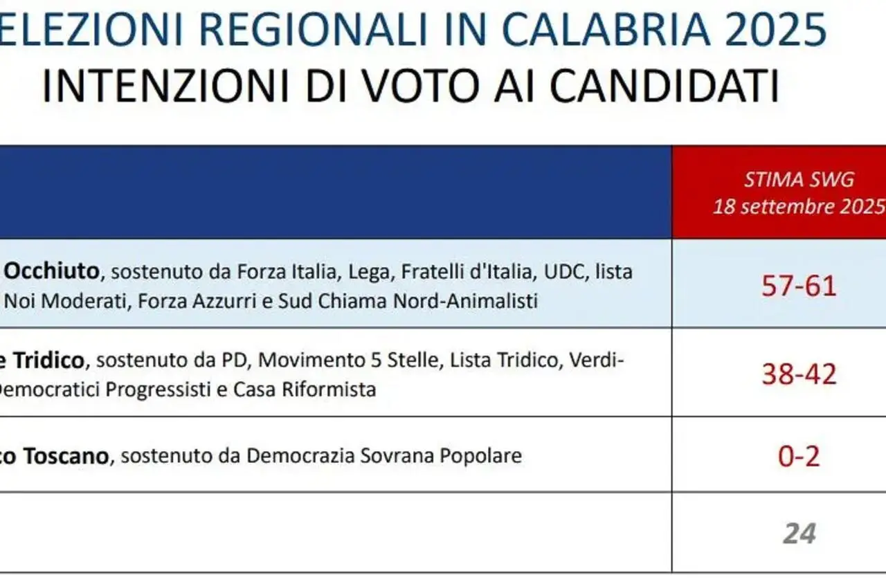 Prosegue la campagna elettorale in Calabria e arrivano nuovi dati sulle intenzioni di voto. L’ultimo sondaggio, realizzato dalla società Swg Spa tra l’11 e il 17 settembre su un campione di 1.005 maggiorenni calabresi, fotografa un vantaggio netto per il presidente uscente Roberto Occhiuto, dato tra il 57% e il 61%. Più staccato il candidato del campo progressista, Pasquale Tridico, fermo tra il 38% e il 42%, mentre Francesco Toscano non supera la soglia del 2%.