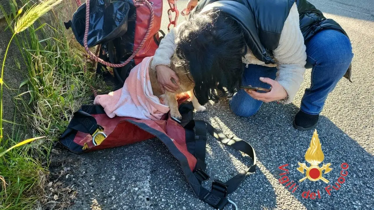 I pompieri, allertati per un salvataggio animale, si sono immediatamente recati sul posto e hanno avviato le delicate operazioni di recupero. Utilizzando le attrezzature Speleo Alpino Fluviali (SAF) in dotazione, gli operatori si sono calati lungo la scarpata, raggiungendo il piccolo cane in difficoltà.