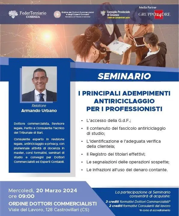 Si terrà mercoledì 20 marzo a partire dalle ore 9 il SEMINARIO ANTIRICICLAGGIO per professionisti a cura di FederTerziario Cosenza, in partnership con l'Ordine dei Dottori Commercialisti ed Esperti Contabili di Castrovillari, il Consiglio provinciale di Cosenza dell'Ordine dei Consulenti del Lavoro ed il Gruppo 24 ORE in qualità di media partner.