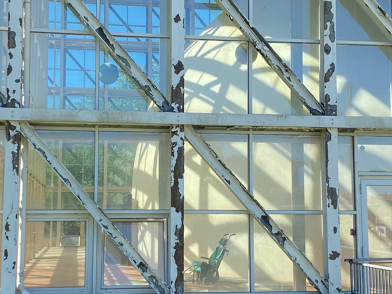Ritorniamo sul posto per osservare e documentare lo stato dell'arte e con grande rammarico notiamo che è sempre più fatiscente. L'erba è altissima, le pareti iniziano a deteriorarsi in maniera drastica, all'interno si vede poco, non è possibile accedere per poter fotografare se non al di fuori del recinto, ovviamente. Si intravede un sedia, probabilmente usata per trasporto disabili o altro, non vorremmo scrivere delle inesattezze.