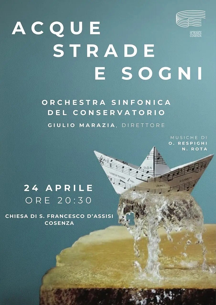 Sarà un percorso tra immagini, emozioni e suggestioni quello proposto dal Conservatorio di Cosenza nel concerto in programma venerdì 24 aprile alle 20.30 nella Chiesa di San Francesco d’Assisi. “Acque, Strade e Sogni” è il filo conduttore di un evento che vedrà protagonista l’Orchestra Sinfonica del Conservatorio, diretta dal maestro Giulio Marazia. Il programma unisce tre dimensioni evocative attraverso la musica: l’acqua, rappresentata dalle celebri “Fontane di Roma” di Ottorino Respighi; le strade, raccontate nella suite tratta dal balletto “La strada” di Nino Rota; e i sogni, elemento simbolico che attraversa l’intero concerto.