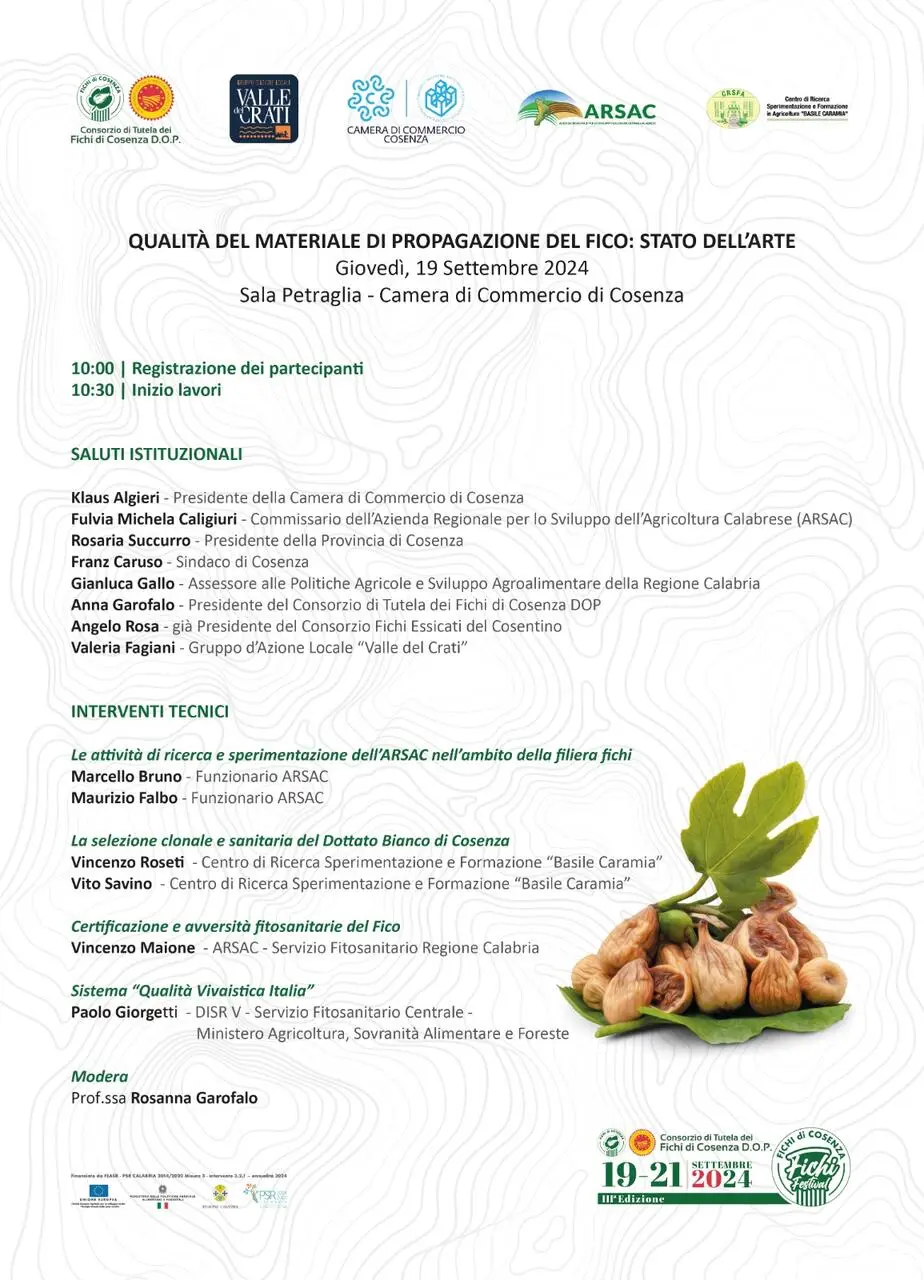 L’appuntamento si è svolto a partire dalle ore 10:00 presso la Camera di Commercio di Cosenza, dove esperti del settore si sono riuniti per discutere sul tema “Qualità del materiale di propagazione del fico: stato dell’arte”. Il convegno è stato patrocinato dalla Camera di Commercio di Cosenza, dall’Arsac e dal Centro di Ricerca Sperimentazione e Formazione in Agricoltura “Basile Caramia”.