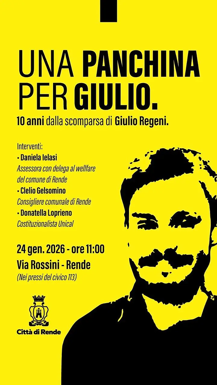 In occasione di questo tragico anniversario, l’Comune di Rende ha deciso di rendere omaggio alla memoria del giovane ricercatore con una cerimonia pubblica dal forte valore simbolico. L’iniziativa, intitolata “Una panchina per Giulio”, si svolgerà la mattina del 24 gennaio, a partire dalle ore 11, in via Rossini, all’altezza del civico 113. Un gesto semplice ma significativo, pensato per mantenere viva l’attenzione su una vicenda che riguarda non solo una famiglia, ma l’intera coscienza civile del Paese.