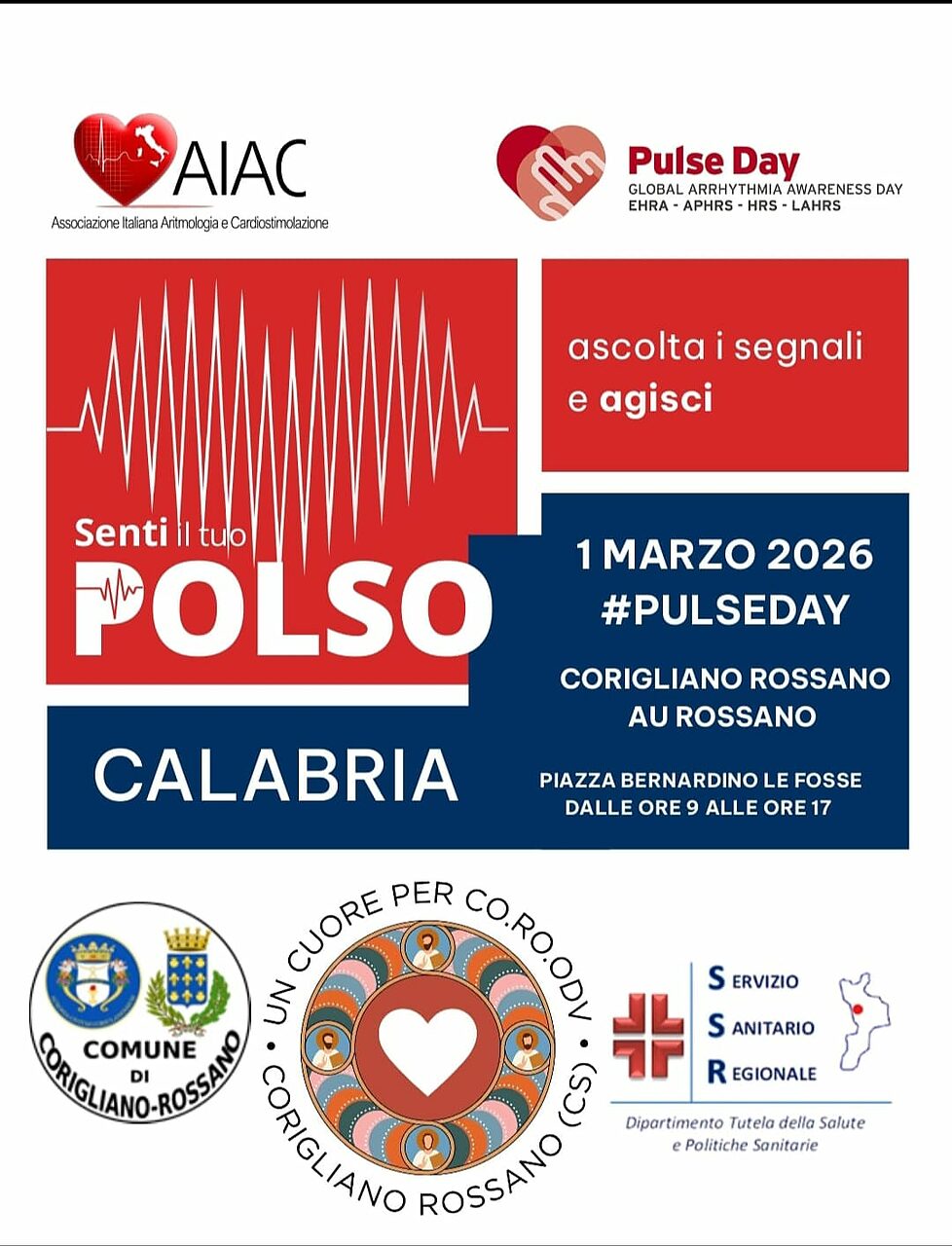 Il Reparto di Cardiologia dell’ospedale di Rossano, sotto la guida della dottoressa Silvana De Bonis, rinnova il suo impegno verso la cittadinanza unendo le forze con l’associazione “Un Cuore per CoRo”. L’occasione è il Pulse Day, la giornata mondiale del controllo del polso promossa dall’Aiac, l’Associazione Italiana di Aritmologia e Cardiostimolazione. Questa iniziativa nasce per accendere i riflettori sulle aritmie cardiache, disturbi che troppo spesso passano inosservati ma che richiedono un’attenzione costante per evitare complicazioni gravi.