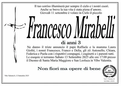 Cronaca | Calabria News 24Vibo Valentia piange il piccolo Francesco: “Il tuo sorriso illuminerà per sempre il cielo”La commozione è così profonda da aver spinto il sindaco Vincenzo Francesco Romeo a proclamare il lutto cittadino nella giornata di sabato 13 settembre Redazione Calabria News 24 / 12.09.2025 15:45